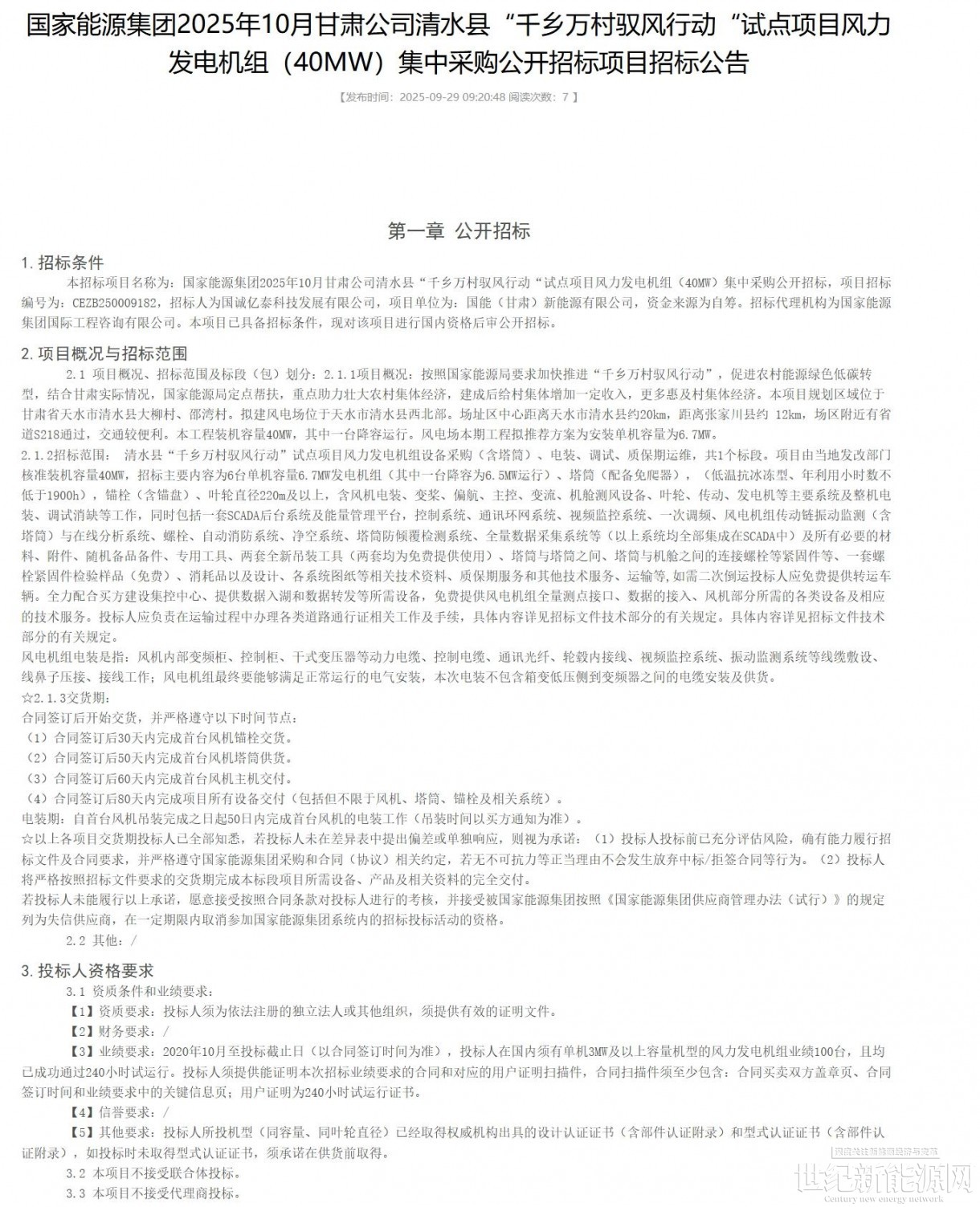 9月29日,国家能源集团2025年10月甘肃公司清水县“千乡万村驭风行动“试点项目风力发电机组(40MW)集中采购公开招标。