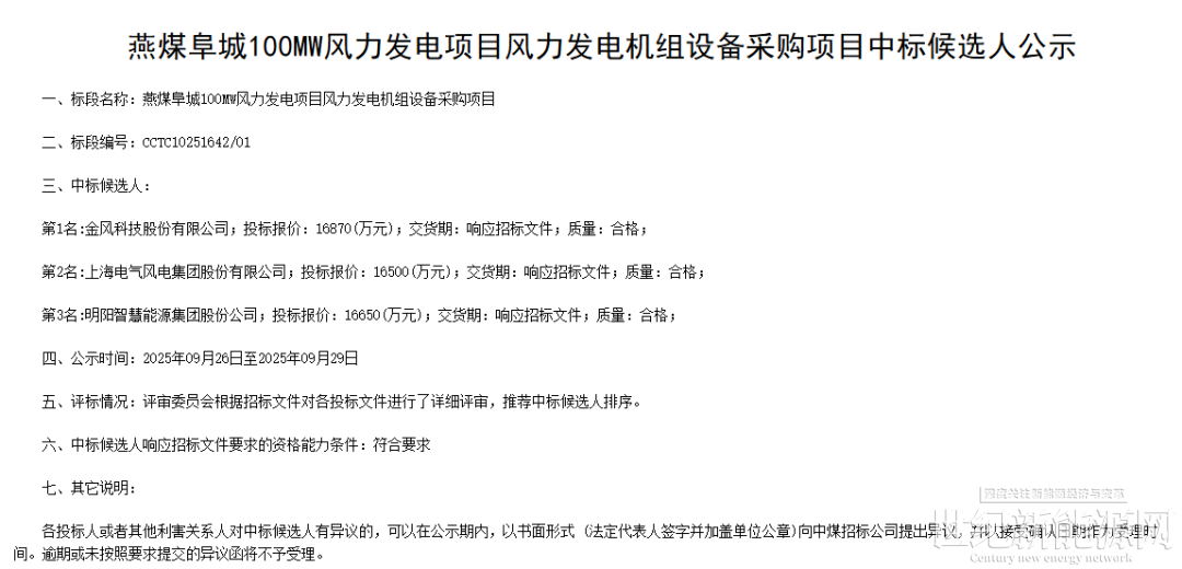 近日,燕煤阜城100MW风力发电项目风力发电机组设备采购开标,金风科技为第一中标候选人,报价1.687亿元。
