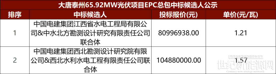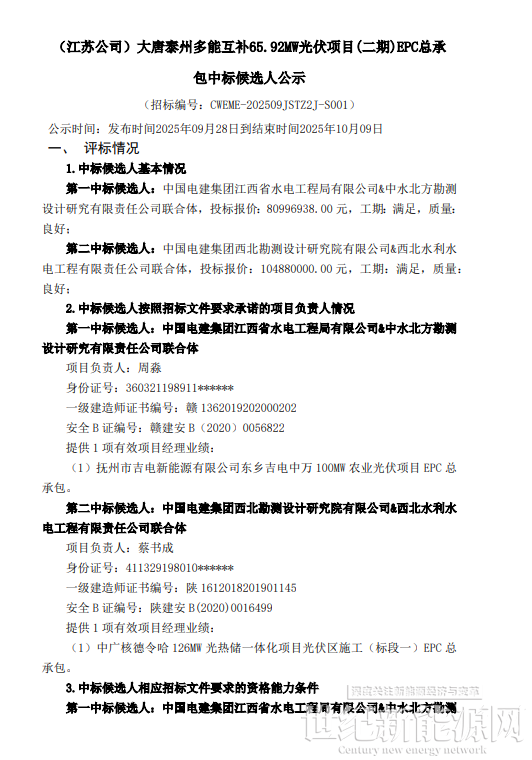 2025年9月28日,【(江苏公司)大唐泰州多能互补65.92MW光伏项目(二期)EPC总承包】中标候选人公示。