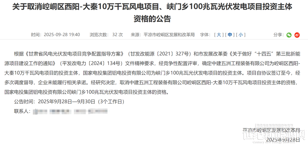 9月28日平凉市崆峒区发展和改革局发布了“关于取消崆峒区西阳-大秦100MW风电项目、峡门乡100MW光伏发电项目投资主体资格”的公告!