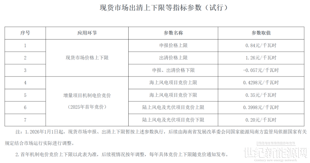 3.完善市场价格机制。适当放宽现货市场限价,现货市场申报、出清价格上限考虑目前省内燃料综合成本和用户承受能力等因素确定;申报、出清价格下限考虑新能源在电力市场外可获得的绿证收益、财政补贴等因素确定,后续由海南省发展改革委会同国家能源局南方监管局依据国家有关规定结合市场运行实际进行调整。接受市场形成价格的新能源项目,结算价格按照实时市场分时价格确定。价格上下限等具体参数见附表。