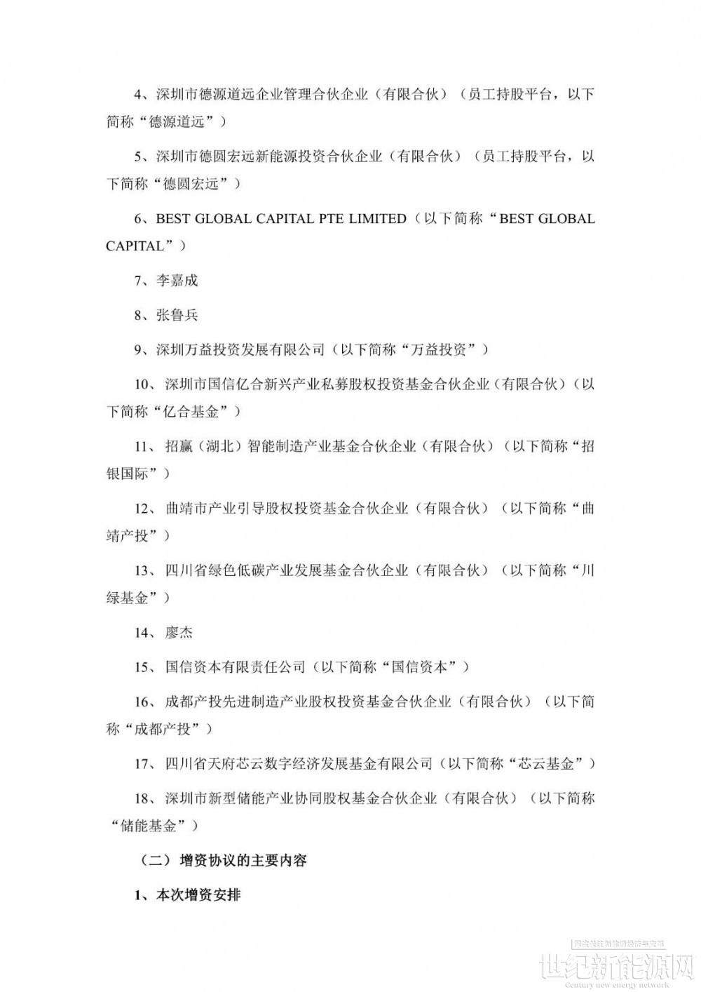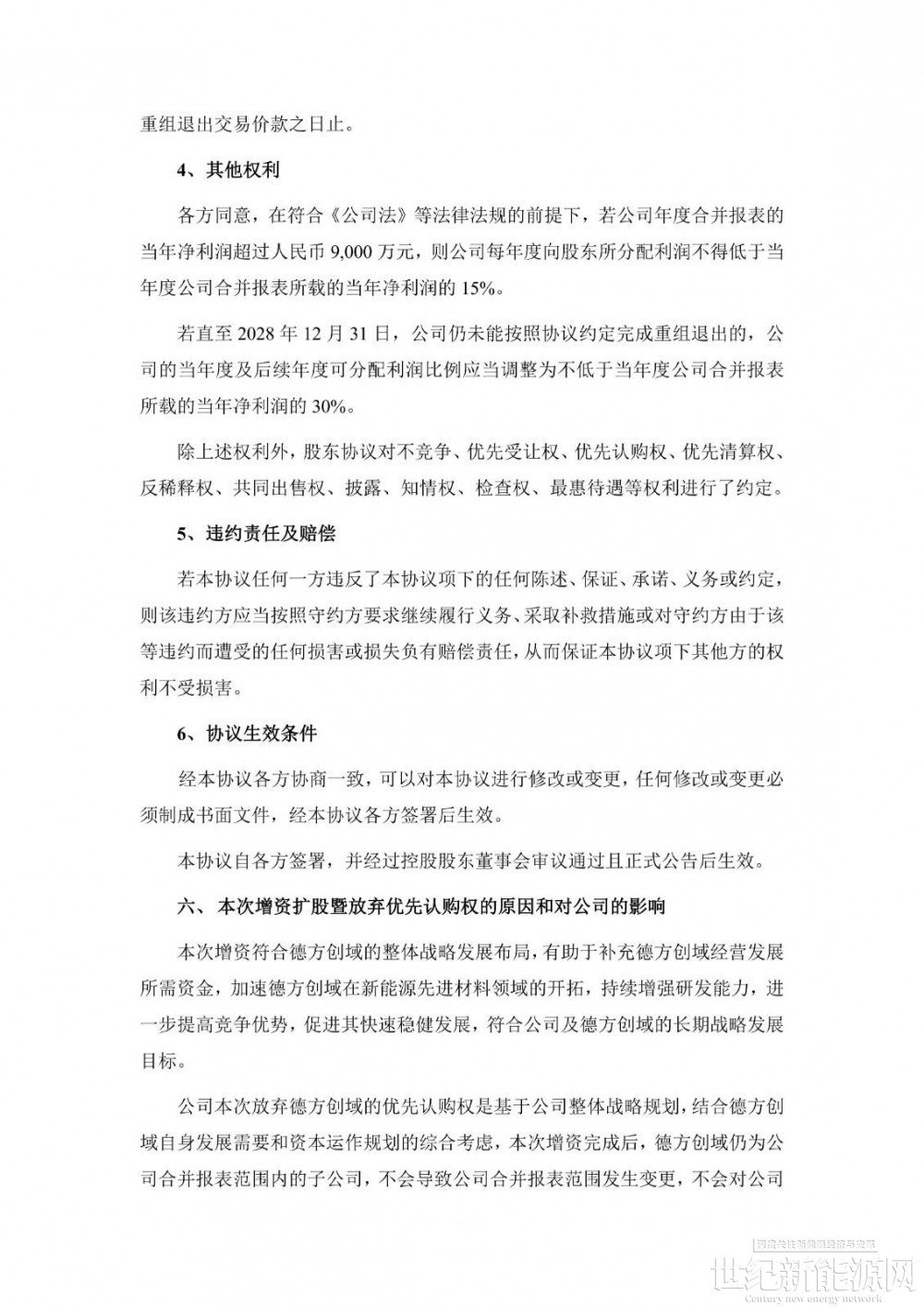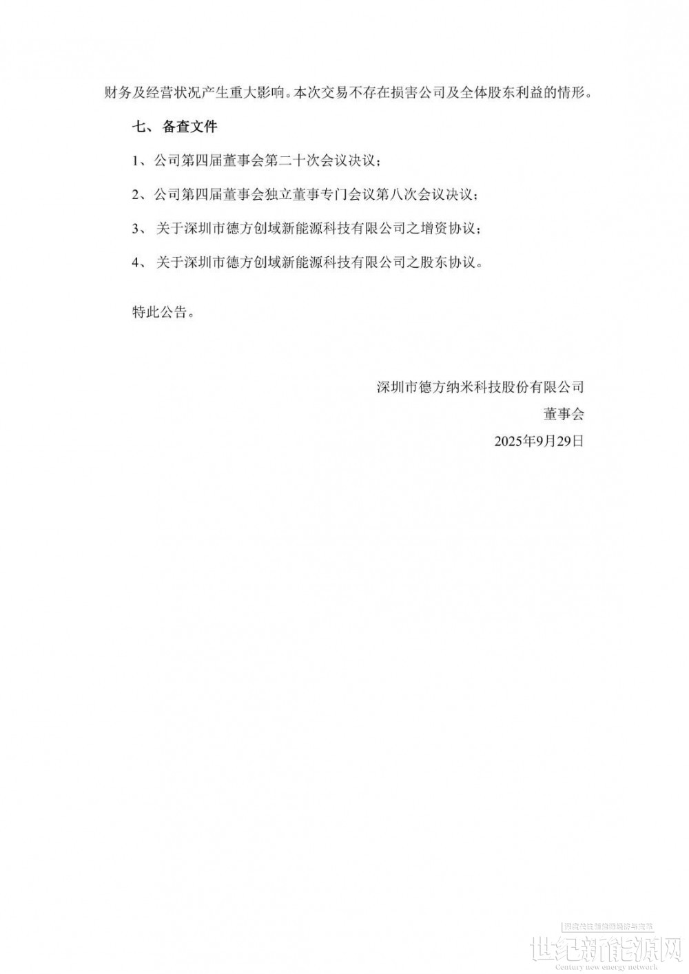9月29日,德方纳米发布公告称,为促进公司控股子公司深圳市德方创域新能源科技有限公司长远健康发展,增强德方创域的综合实力,德方创域以增资扩股的方式引进战略投资者深圳市新型储能产业协同股权基金合伙企业(有限合伙)。本次增资金额为人民币3,000.00万元,认购德方创域新增注册资本130.670740万元,并取得德方创域本次交易交割完成后基于完全摊薄基础上1.347381%的股权。本次增资完成后,德方创域的注册资本由9,567.457845万元增加至9,698.128585万元。