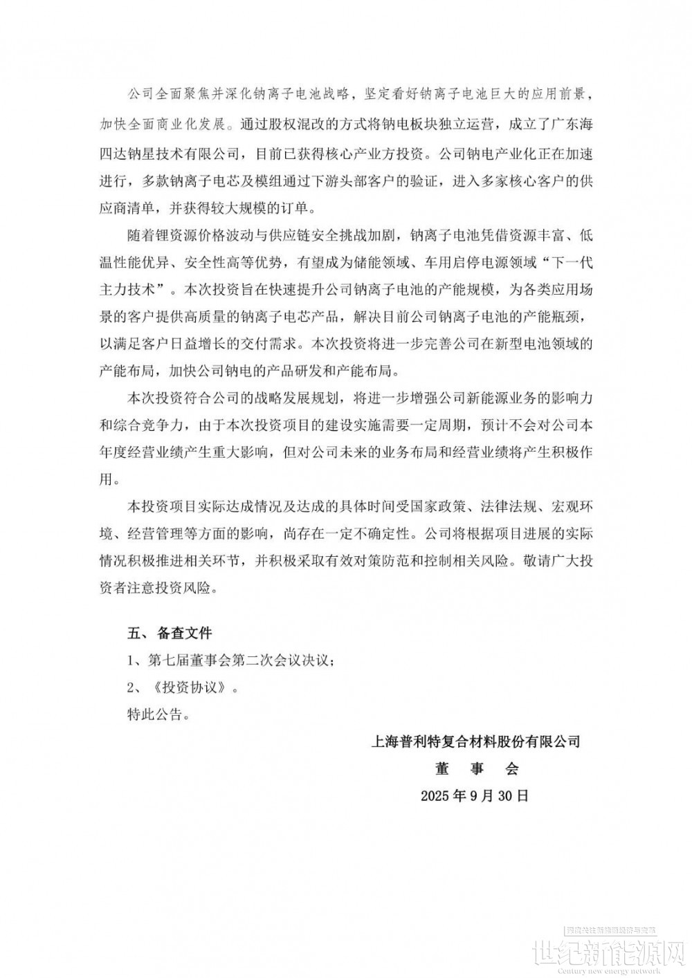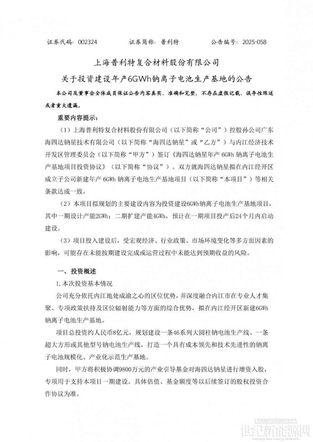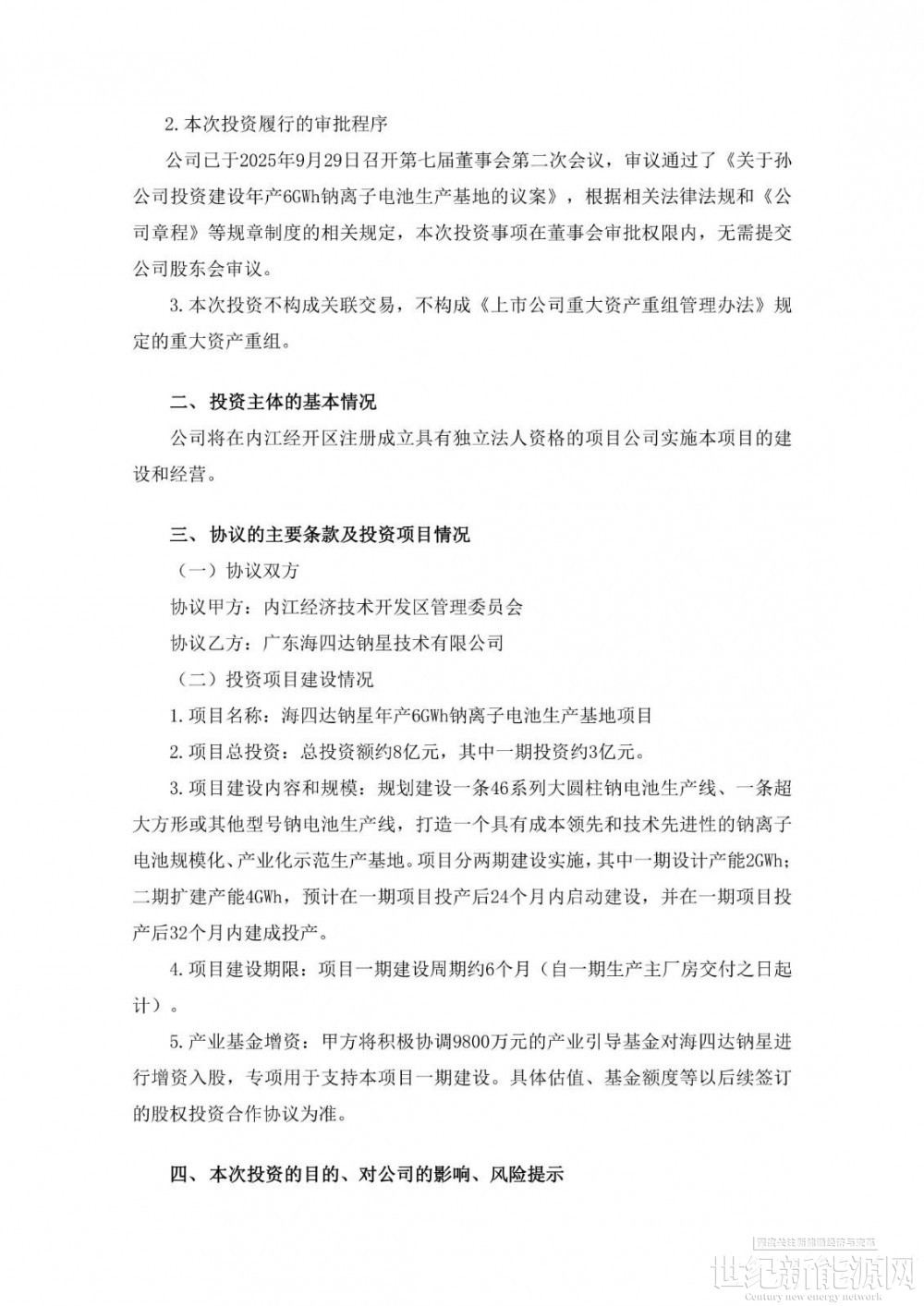 9月29日,普利特发布公告称,公司控股孙公司广东海四达钠星技术有限公司(与内江经济技术开发区管理委员会签订《海四达钠星年产6GWh钠离子电池生产基地项目投资协议》。双方就海四达钠星拟在内江经开区成立子公司新建年产6GWh钠离子电池生产基地项目等相关条款达成一致。