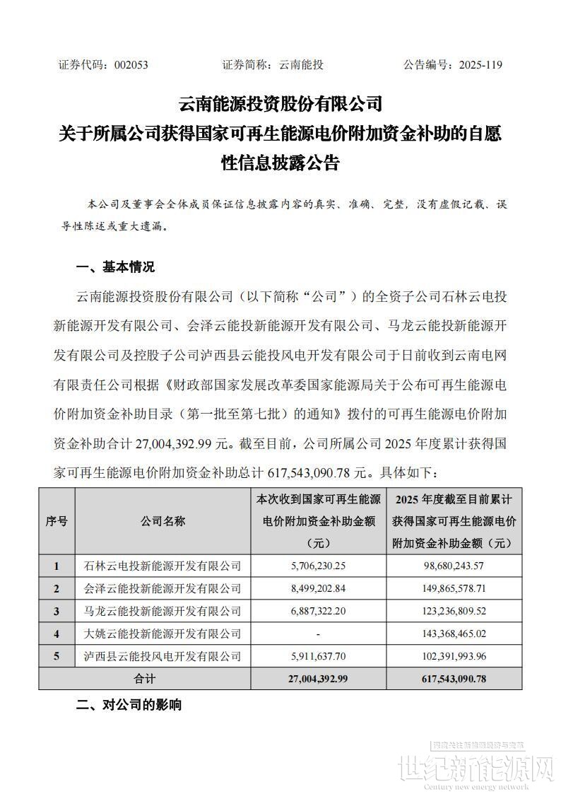 截至目前,云南能投所属公司 2025 年度累计获得国家可再生能源电价附加资金补助总计 617,543,090.78 元。