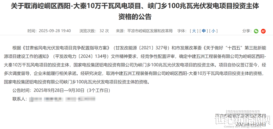9月28日平凉市崆峒区发展和改革局发布了“关于取消崆峒区西阳-大秦100MW风电项目、峡门乡100MW光伏发电项目投资主体资格”的公告!