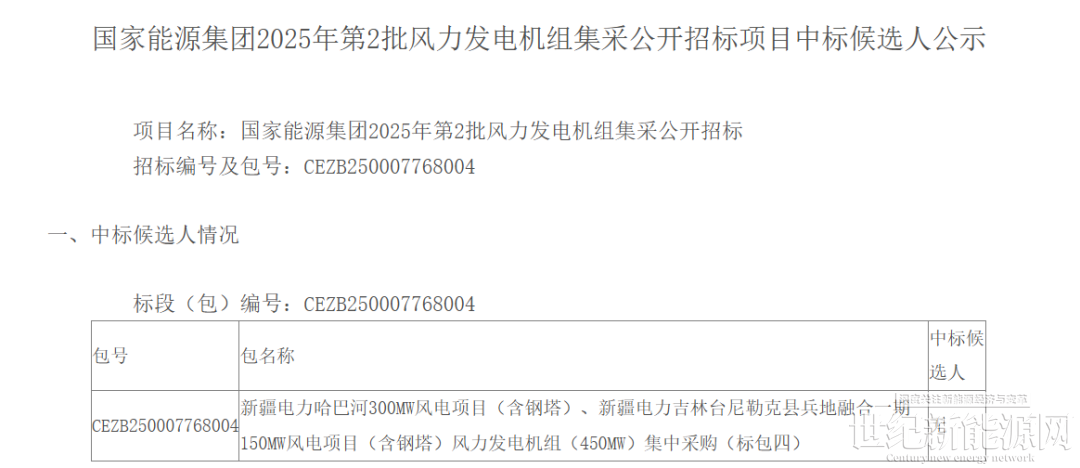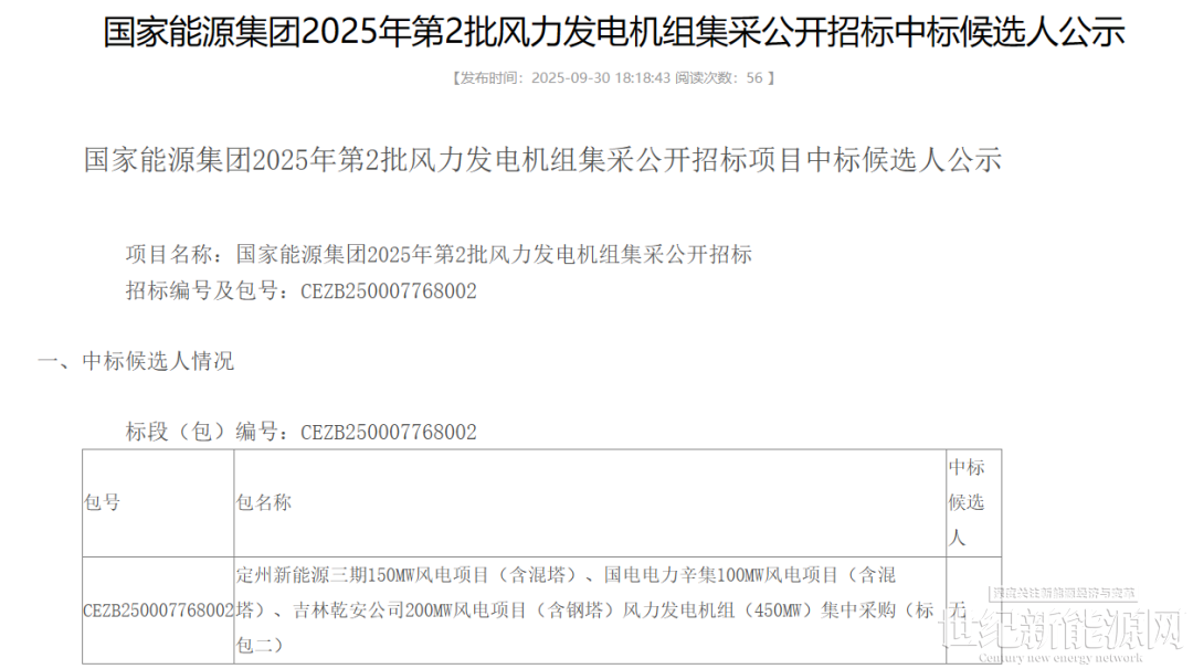 9月30日,国能e招发布国家能源集团2025年第2批风力发电机组集采公开招标项目标包二、标包四中标候选人公示的公告。