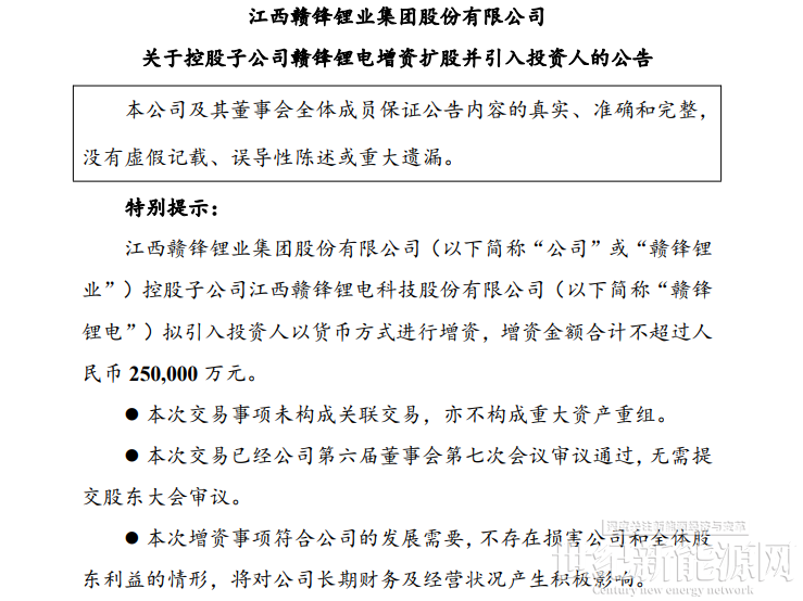近日,赣锋锂业发布关于其控股子公司赣锋锂电增资扩股并引入投资人的公告。