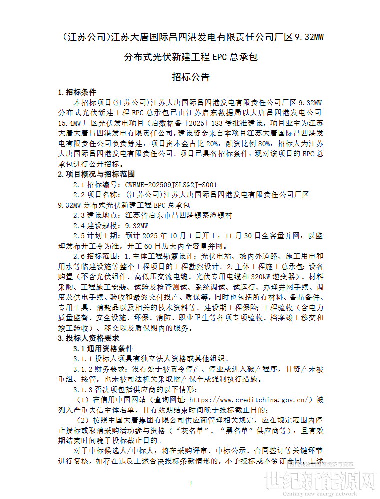 近日,【(江苏公司)江苏大唐国际吕四港发电有限责任公司厂区9.32MW分布式光伏新建工程EPC】中标候选人公示!其中: