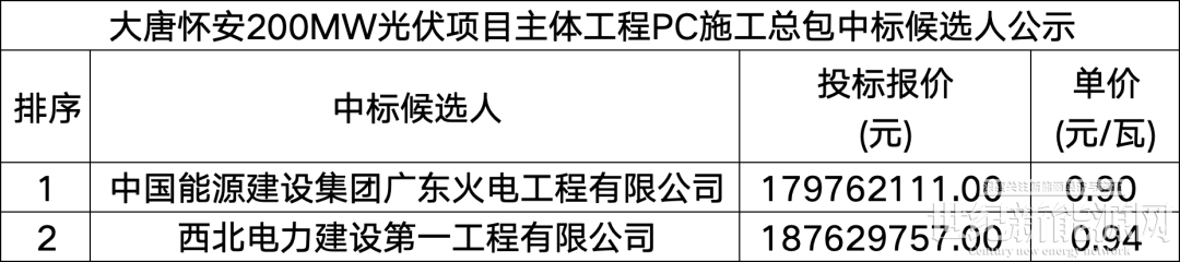 近日,大唐建投怀安新能源有限公司20万千瓦光伏项目主体工程PC施工总承包中标候选人公示,中国能源建设集团广东火电工程有限公司以0.9元/瓦为第一中标候选人,招标人及项目业主为大唐建投怀安新能源有限公司。