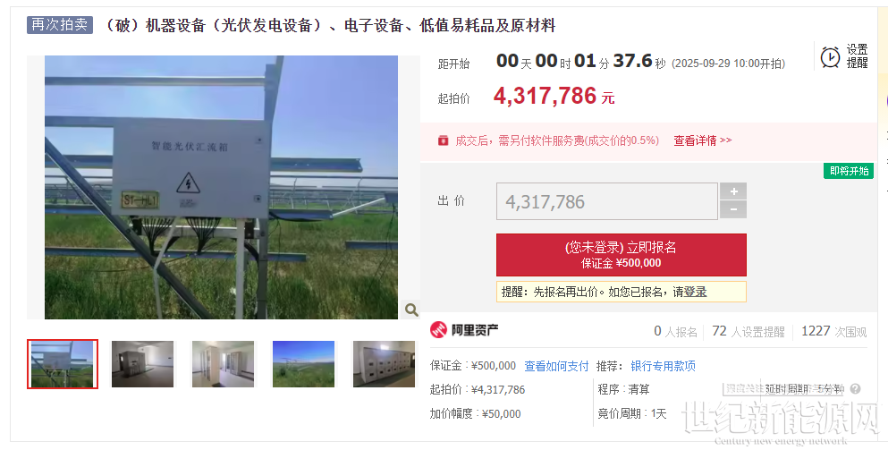 据阿里资产拍卖平台显示,近日,大唐尖山天硕阿鲁科尔沁旗新能源有限公司管理人公开拍卖名下破产企业大唐尖山天硕阿鲁科尔沁旗新能源有限公司的机器设备(光伏发电设备)、电子设备、低值易耗品及原材料等资产。