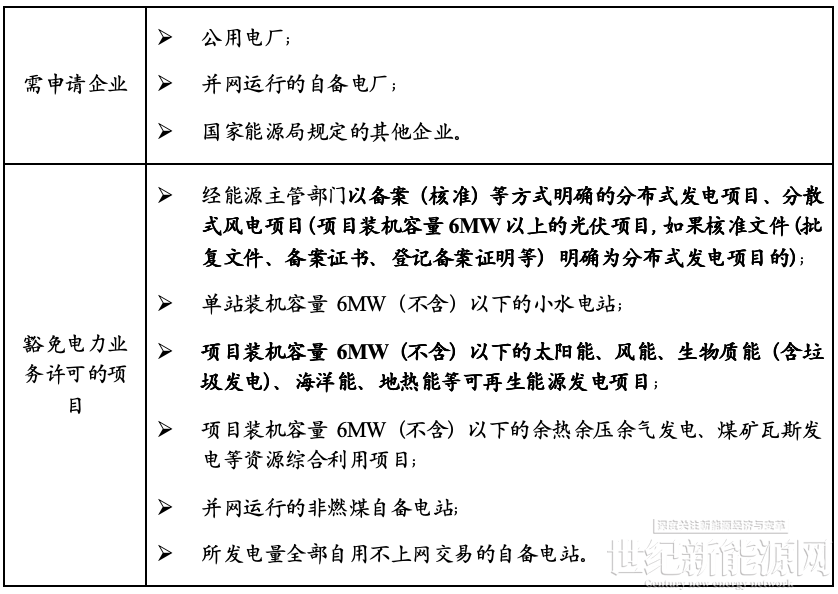 (一)电力业务许可需申请企业、可豁免许可证的情形