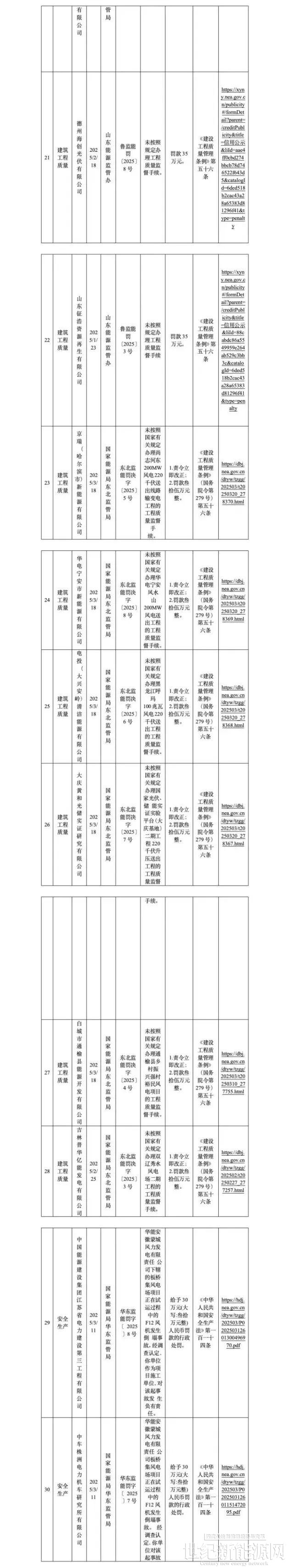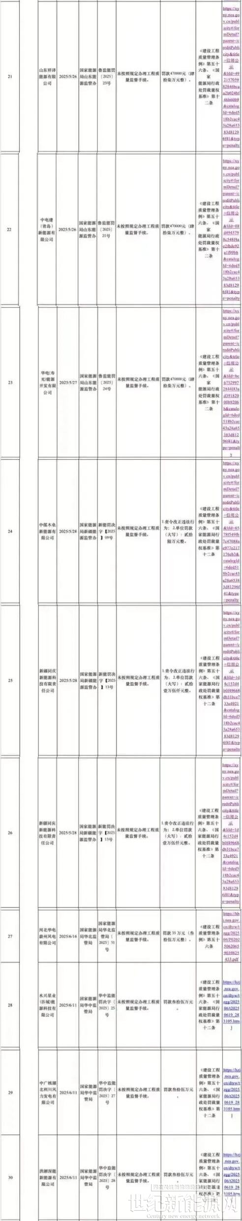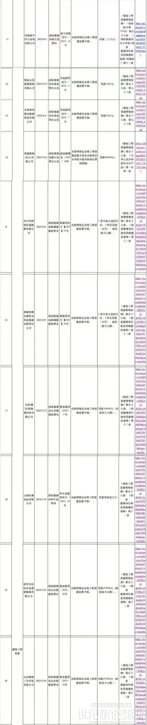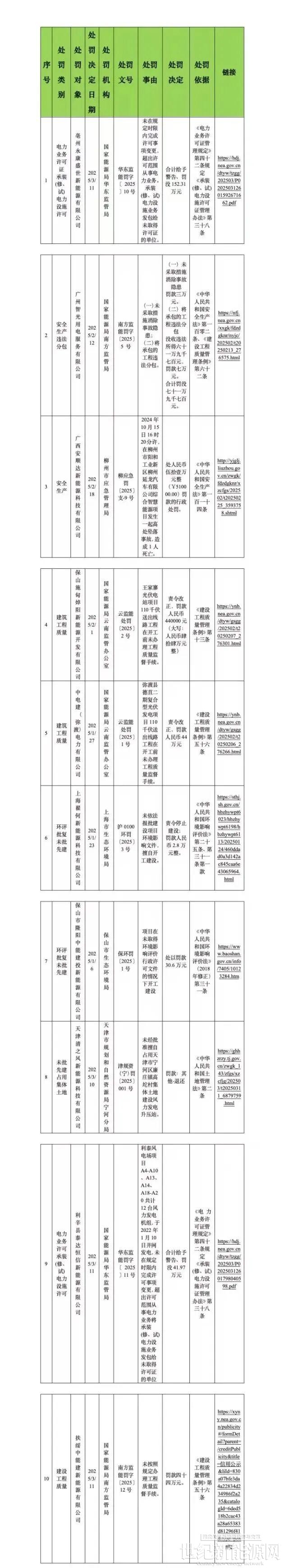 “十四五”期间,我国光伏、风电下游投资建设规模逐年增长,但与此同时也催生了一系列在建设、运营过程中的一系列违规行为。有第三方机构通过检索国家能源局、国家能源局地方监管局及其他政府网站,将一系列容易被忽视的问题进行了分析与整理,供大家借鉴。2025年第一季度共检索到52篇新能源公司被处罚案例。其中,因未办理建筑工程质量监督手续受处罚的案件最多,共计22起(占比38%);因安全生产事由受处罚的共计12起(占比22%);因电力业务许可证相关问题受处罚的共计8起(占比14%);未按照规定进行电力企业信息报送的共计6起(占比11%);其他(未取得环评手续、未经批准占用土地、承装(修、试)电力设施许可等)共计8起(占比15%)。第二季度共收集到67篇关于新能源项目处罚案例。其中,因未办理建筑工程质量监督手续受处罚的案件最多,共计34起(占比51%);因承装(修、试)电力设施许可事由受处罚的共计3起(占比5%);因安全生产事由受处罚的共计8起(占比12%);因电力业务许可证相关问题受处罚的共计3起(占比4%);因未批先建占用集体土地而受处罚的共计3起(占比4%);其他(未取得建设工程规划许可证、企业信息公示事由、信息披露违法违规、环评批复未批先建、未依法备案环境影响登记表、违反大气污染防治管理、未经消防设计审查擅自施工、违反消防控制室值班制度、长期不营业、违反环境噪声污染防治管理等)共计16起(占比24%)。其中,因未办理建设工程质量监督手续开工建设及违反安全生产的相关规定被处罚情依旧普遍,其中因未办理建筑工程质量监督手续即进行开工建设导致被处罚的情形最多,因安全生产导致被处罚的数量位居于次位。