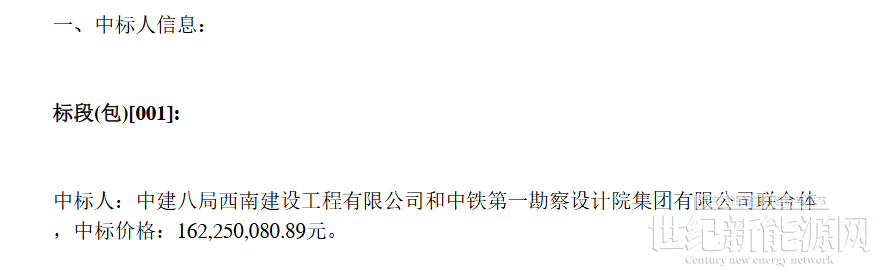 该项目中标人为中建八局西南建设工程有限公司和中铁第一勘察设计院集团有限公司联合体,中标金额为162250080.89元,折算单价为1.62元/W。