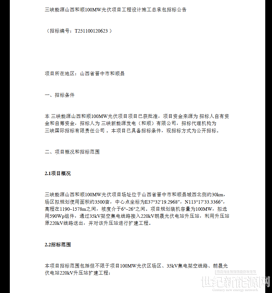 近日,三峡能源山西和顺100MW光伏项目工程设计施工总承包项目中标结果公示,其中: