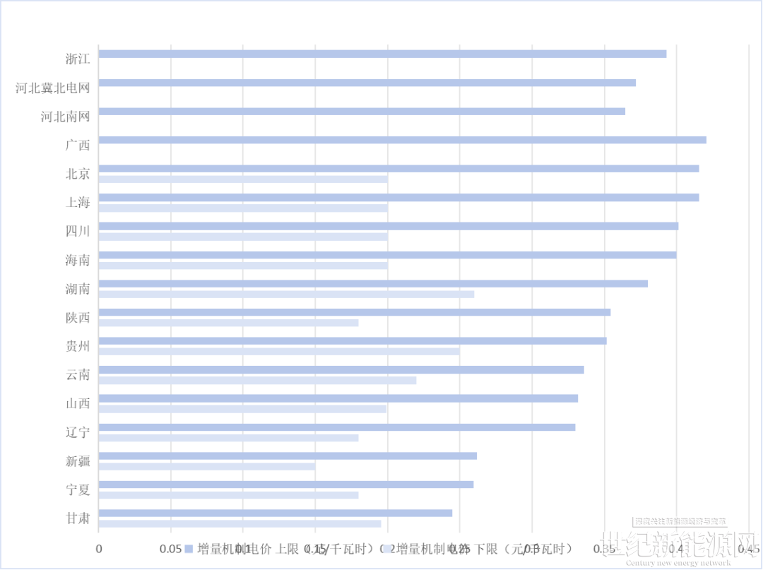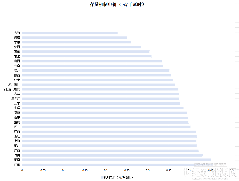 而重庆、山东、安徽、辽宁、黑龙江、吉林、河北冀北电网、河北南网、北京、陕西、贵州、福建等12省机制电价则均在0.35~0.4元/度之间。