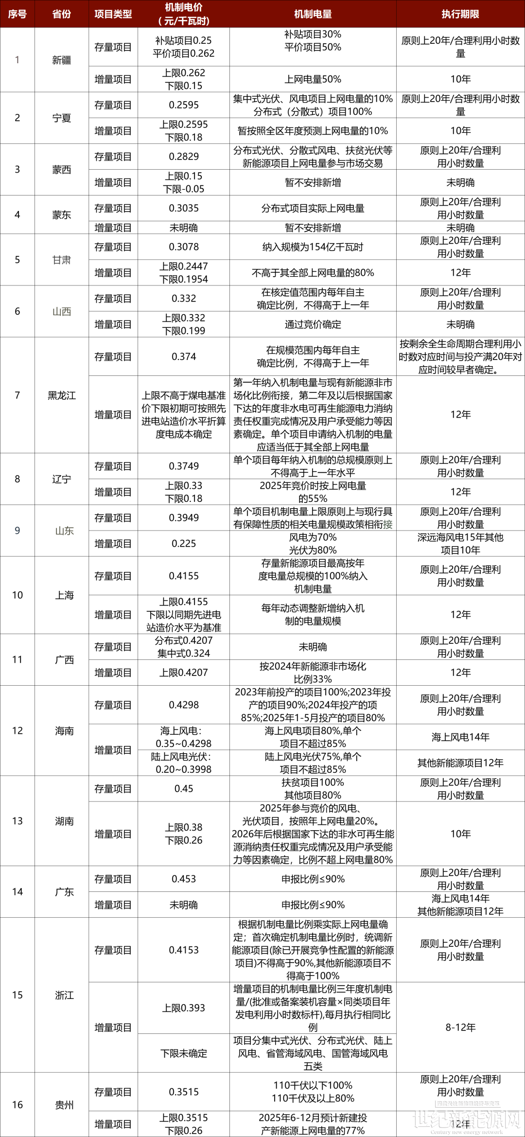 蒙东、山西、安徽、江西、青海5省未明确增量项目执行期限,但是综合考虑或按照同类项目回收初始投资的平均期限等因素确定,如遇重大政策变化或行业成本变化适时调整。