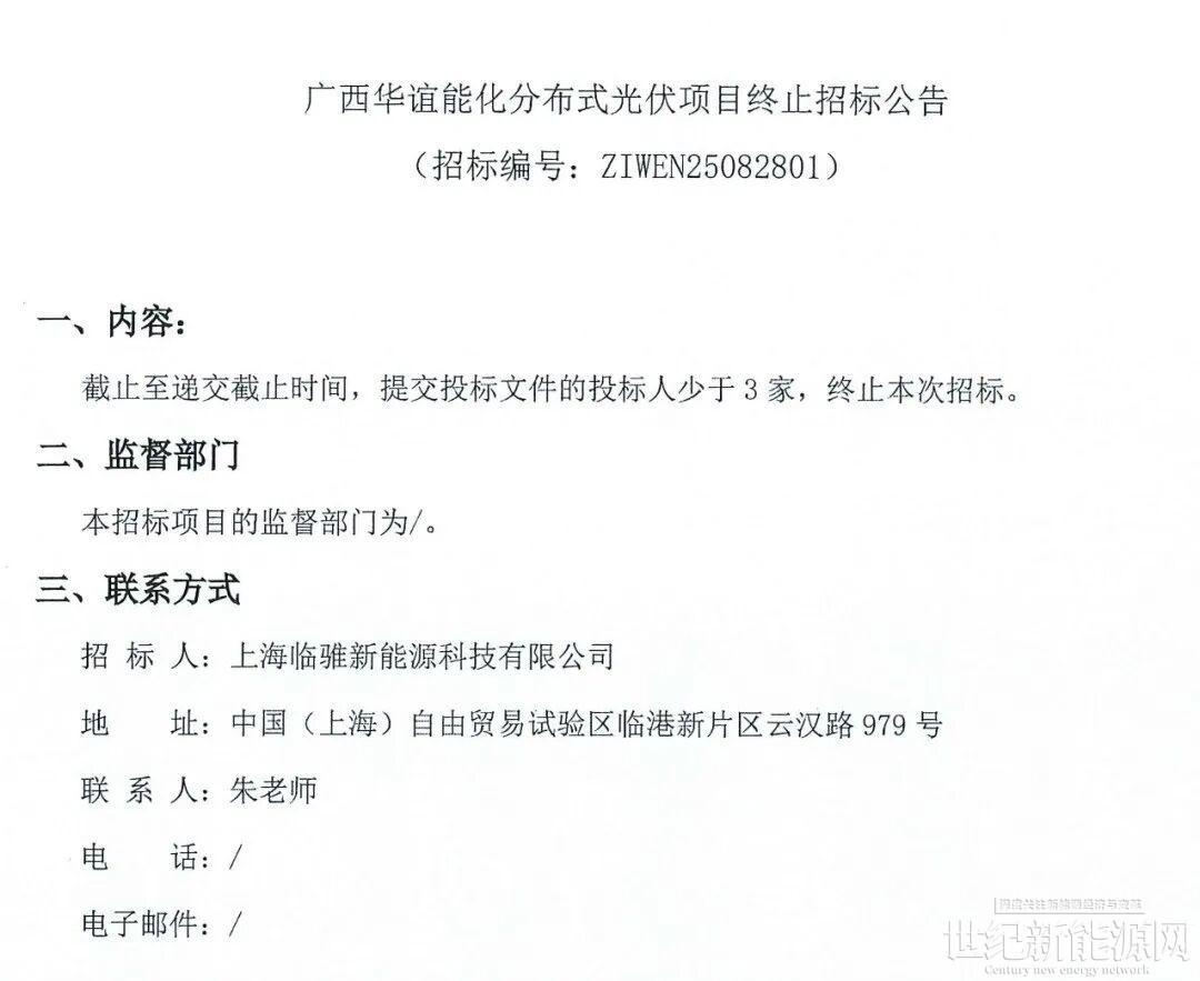 9月18日,广西华谊能化分布式光伏项目发布终止招标公告,公告显示,由于项目截止至递交截止时间,提交投标文件的投标人少于3家,故终止本次招标。项目招标人为上海临骓新能源科技有限公司。