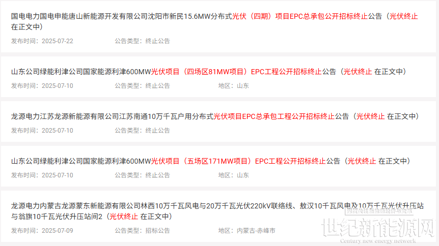 7月,国家能源集团已终止4项光伏EPC招标和1项光伏组件招标,累计项目规模约667MW,涉及河北、山东、江苏多地。