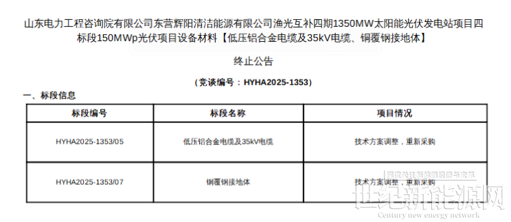 7月9日,东营辉阳清洁能源有限公司渔光互补1350MW太阳能光伏发电站项目四标段150MWp光伏项目设备材料招标终止公告发布。另根据招标公告内容,项目工期要求在2025年4月30日前完成送电。