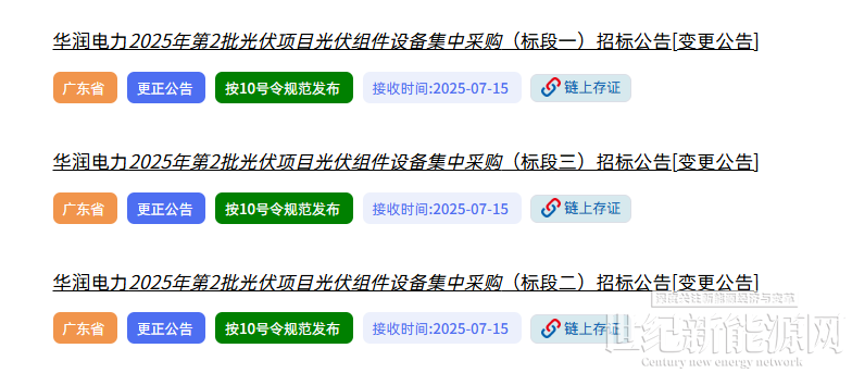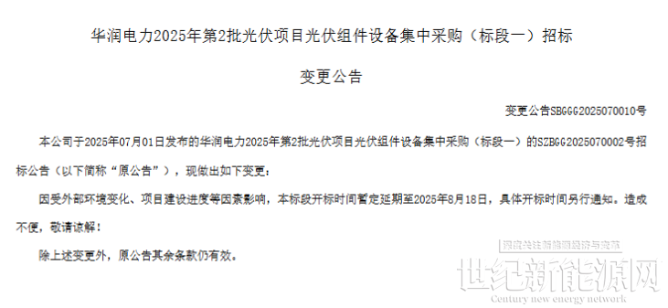 7月15日,华润电力发布2025年第2批光伏项目光伏组件设备集中采购招标变更公告,开标时间暂定延期至2025年8月18日,具体开标时间另行通知。