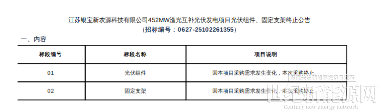 7月16日江苏银宝新农源科技有限公司对外发布终止公告,因项目采购需求发生变化,决定终止452MW渔光互补光伏发电项目光伏组件、固定支架采购招标。