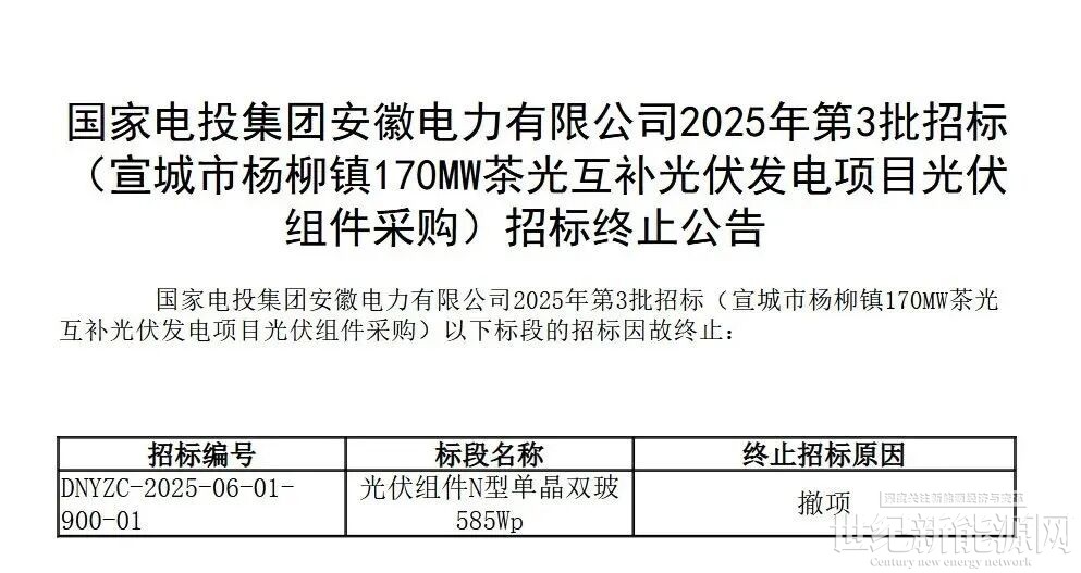 7月25日,国家电投集团安徽电力有限公司发布招标终止公告,因车厢对2025年第3批招标(宣城市杨柳镇170MW茶光互补光伏发电项目光伏组件采购)实施项目终止。