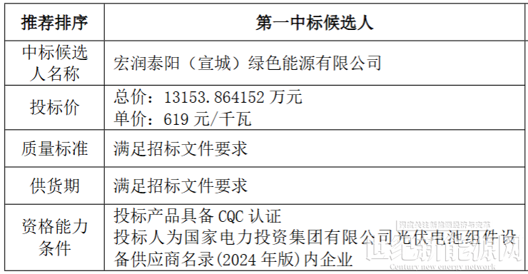 据了解,7月23日,该项目公示中标候选人,仅宏润泰阳(宣城)绿色能源有限公司一家中标,投标单价约合0.619元/W。
