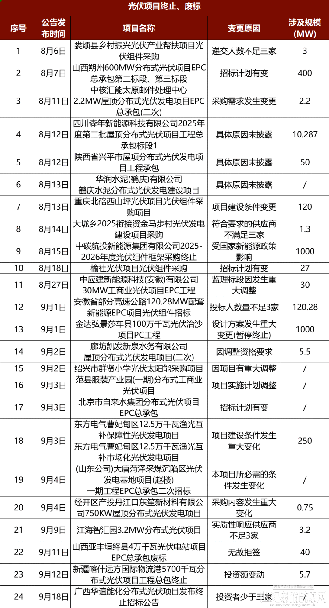 据世纪新能源网团队不完全统计,8月至今,已有超24个光伏项目终止。