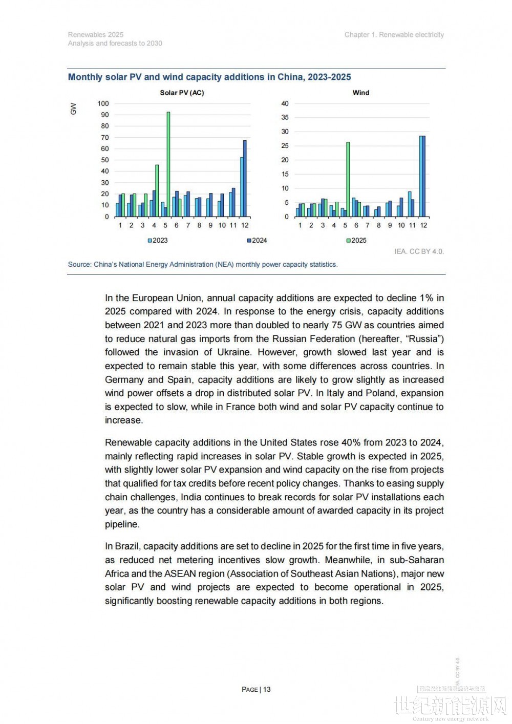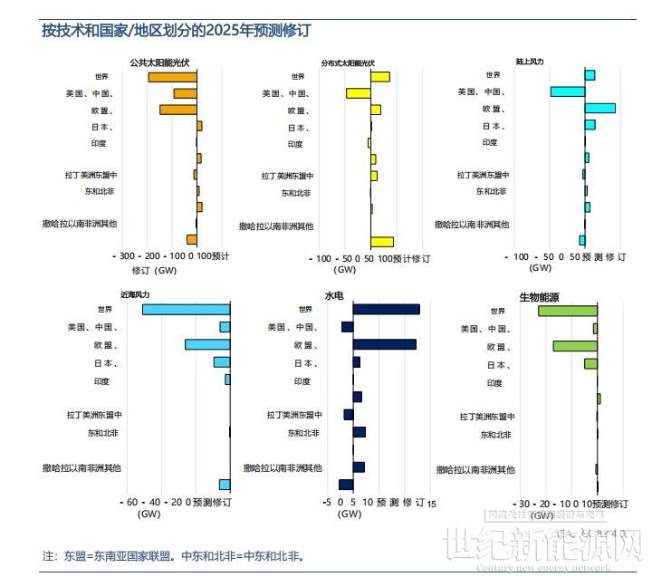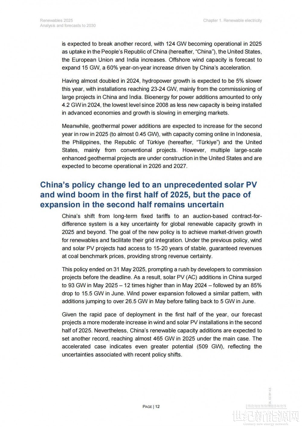 报告对全球可再生能源装机容量增长的预测较去年略有下调,主要原因是美国和中国的政策变化。美国联邦税收优惠政策的提前取消以及其他监管变化,导致 IEA 对美国市场可再生能源的增长预期较去年的预测降低了近 50%。中国从固定电价转向拍卖电价的转变正在影响项目经济效益,导致报告下调了对中国市场可再生能源增长的预测。