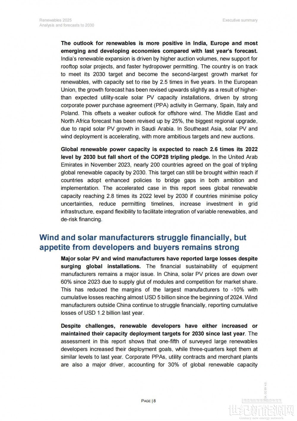 报告认为,尽管全球安装量激增,但主要太阳能光伏和风力制造商仍报告了巨额亏损。设备制造商的财务可持续性仍然是一个主要问题。在中国,由于组件供应过剩和市场份额竞争,自 2023 年以来,太阳能光伏价格已下跌超过 60%。这使得最大的制造商的利润下降到 - 10%,自 2024 年初以来累计损失达到近 50 亿美元。中国以外的风力制造商继续在财务上挣扎,去年报告累计损失 12 亿美元。