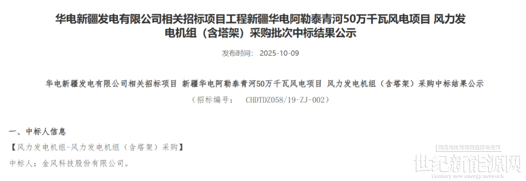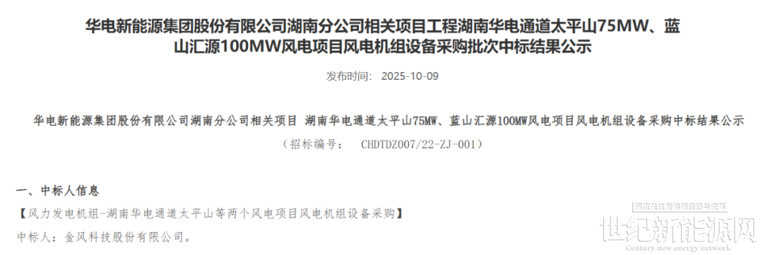 10月9日,中国华电集团电子商务平台发布新疆华电阿勒泰青河50万千瓦风电项目、湖南华电通道太平山75MW、蓝山汇源100MW风电项目风力发电机组采购中标结果公示的公告。