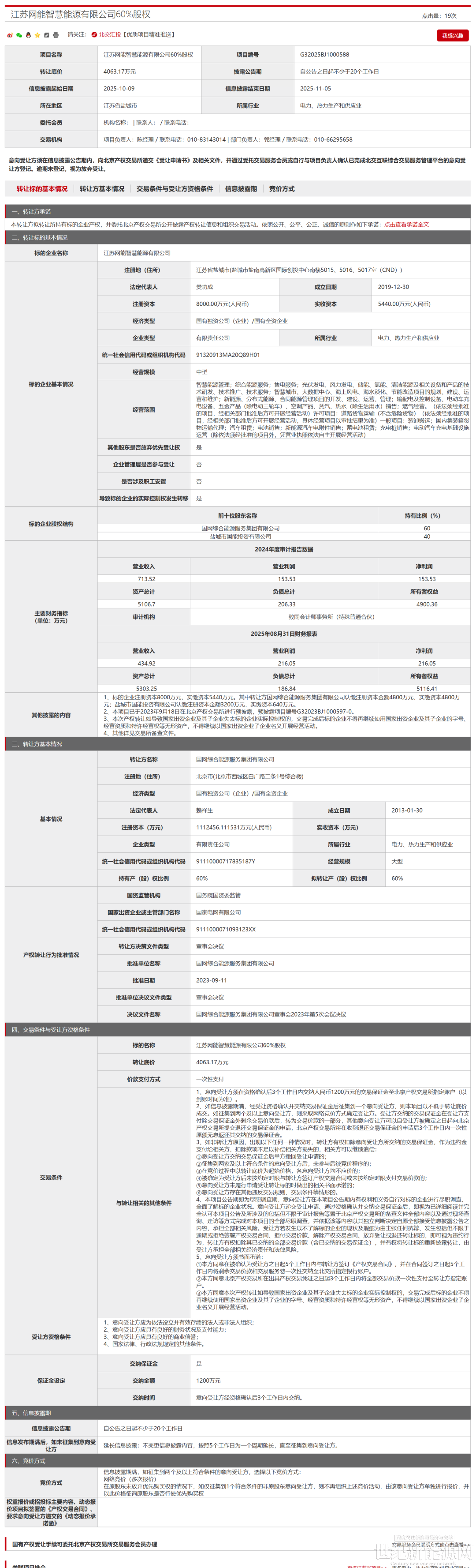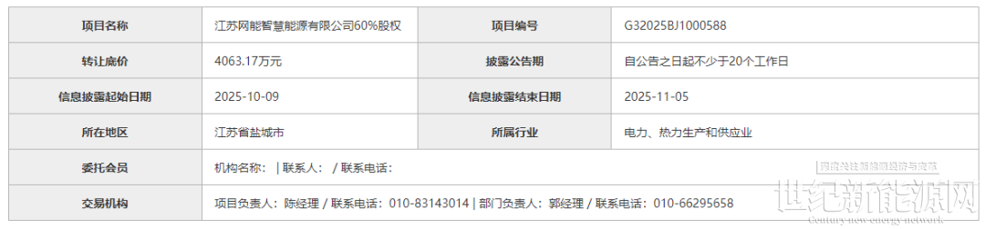10月9日,国网综合能源服务集团有限公司转让江苏网能智慧能源有限公司60%股权,转让底价4063.17万元。