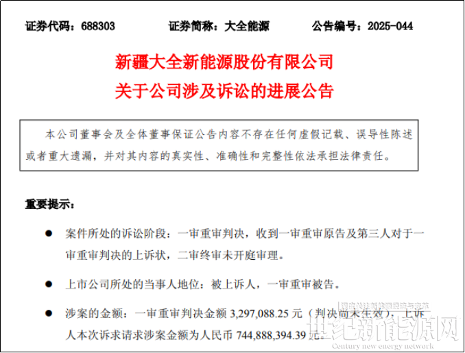 2025年10月9日,新疆大全新能源股份有限公司(以下简称“大全能源”,SH:688303)发布关于公司涉及诉讼的进展情况的公告。