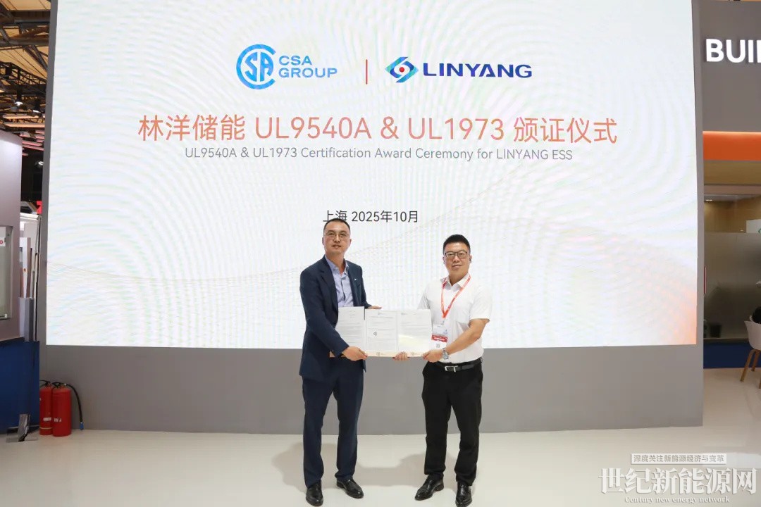 以国际顶尖安全标准奠定全球市场开拓坚实的安全基石。展会期间,林洋储能海外产品液冷Pack成功获得UL 9540A和UL 1973双重认证,同时Power Atlantic®系列5MWh储能系统获得UL 9540A Unit层级认证,标志着林洋储能海外产品在电气安全、机械安全及热失控防范等关键领域已达到国际顶尖水平,彰显了公司对产品安全与可靠性的极致追求。CSA集团工业及新能源商务总监吴巍、林洋能源高级副总裁方壮志共同出席见证。