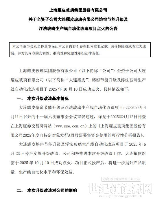 公告显示,上海耀皮玻璃集团股份有限公司全资子公司大连耀皮玻璃有限公司(简称“大连耀皮”)熔窑节能升级及浮法玻璃生产线自动化改造项目于 2025 年 10 月 10 日成功点火。