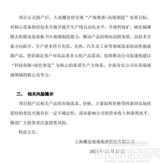 耀皮玻璃表示,项目正式投产后,大连耀皮将实现“产线焕新+高端制造”双重目标,对核心设备熔窑技术升级并提升生产线自动化水平,升级钙钛矿、碲化镉薄膜太阳能电池基板 TCO 玻璃制造能力,推动产品结构向高附加值、高技术含量方向跃升,生产更多符合光伏、光热、汽车及工业等领域需求的高性能玻璃产品,更好满足客户对高品质多元化产品需求。