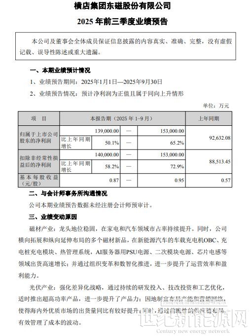 公告显示,横店东磁前三季度归属净利润在13.9-15.3亿元之间,同比增长50.1%-65.2%。