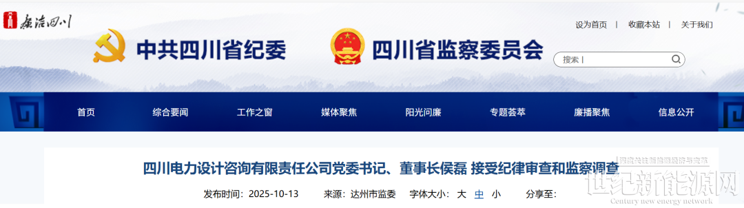 据四川省纪委监委网站10月13日消息,四川电力设计咨询有限责任公司党委书记、董事长侯磊涉嫌严重违纪违法,目前正接受中国电力建设集团有限公司纪委纪律审查,经四川省监委指定达州市监委管辖,达州市监委正对其进行监察调查。