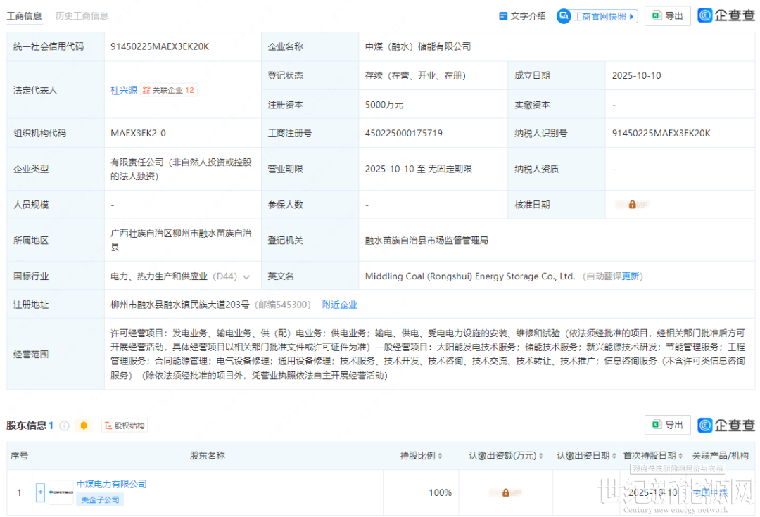 10月10日,中煤(融水)储能有限公司成立,法定代表人为杜兴源,注册资本5000万元。该公司主营业务包括太阳能发电技术服务;储能技术服务;新兴能源技术研发;节能管理服务;工程管理服务;合同能源管理;电气设备修理等。