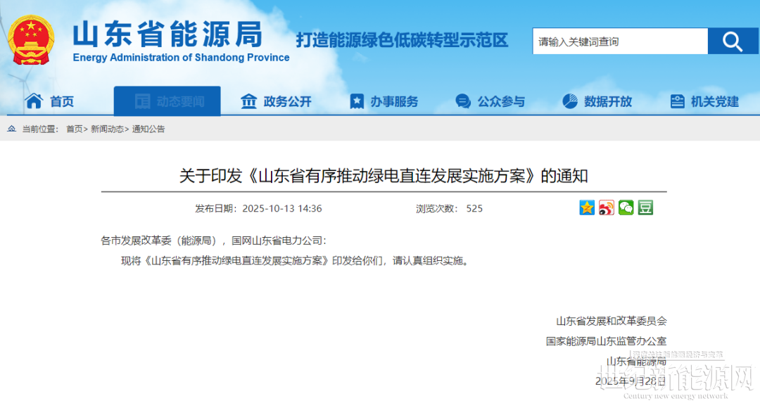 10月13日,山东省发改委、山东能监办、山东省能源局发布关关于印发《山东省有序推动绿电直连发展实施方案》的通知,文件中提出将重点支持四类绿电直连项目,包括新增负荷可配套建设新能源项目、存量负荷已有燃煤燃气自备电厂、有降碳刚性需求的出口外向型企业、消纳受限的新能源项目。