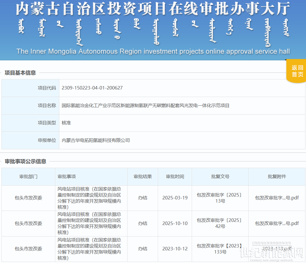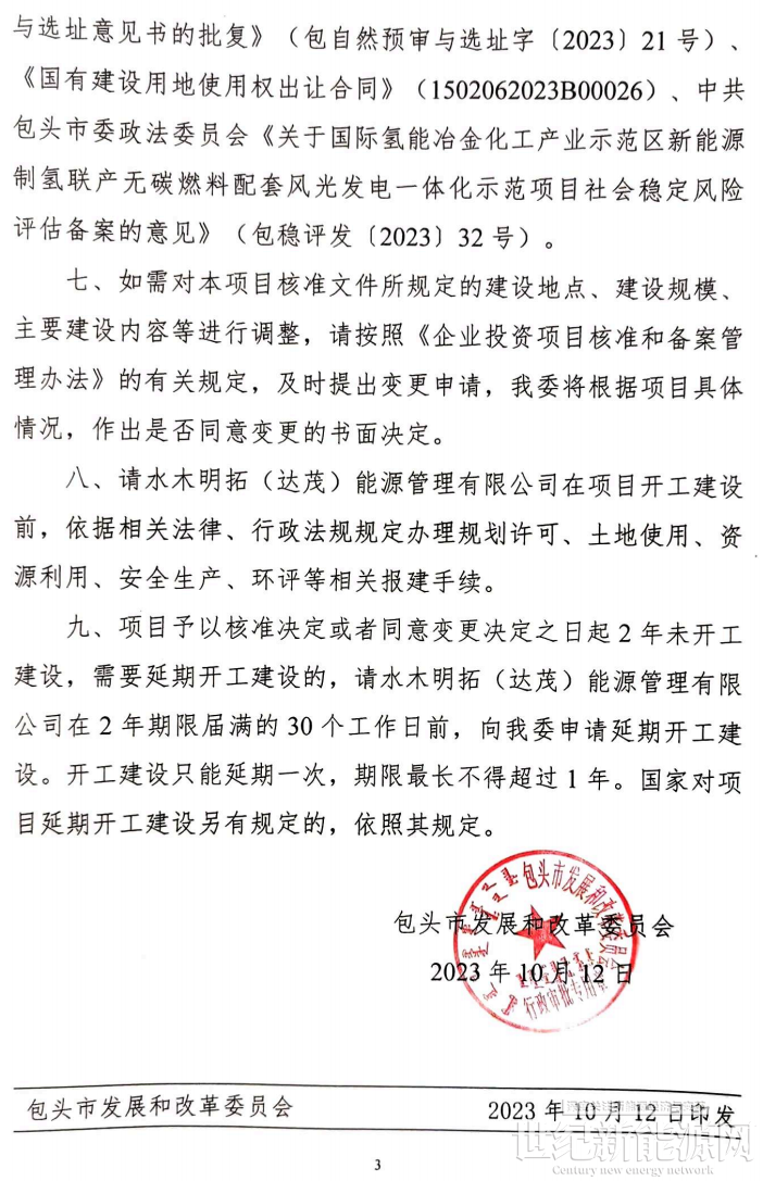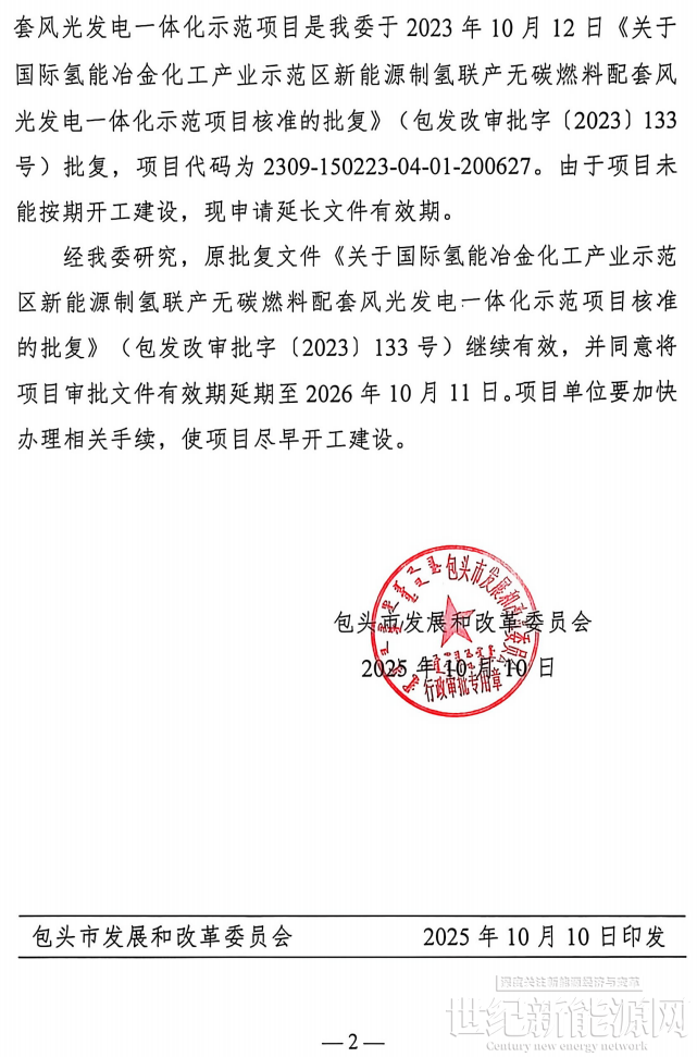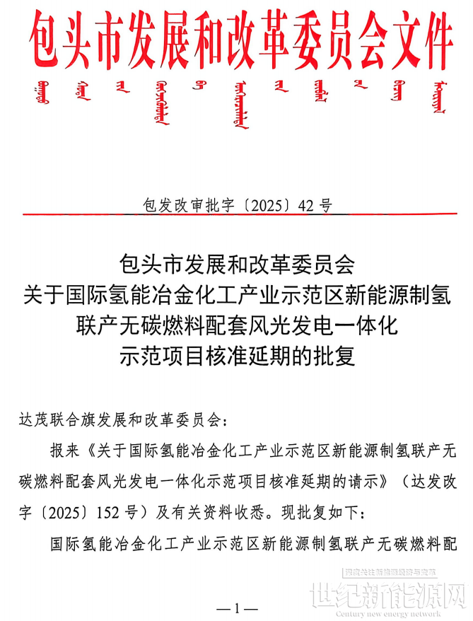 近日,包头市发展和改革委员会关于国际氢能冶金化工产业示范区新能源制氢联产无碳燃料配套风光发电一体化示范项目核准延期的批复。