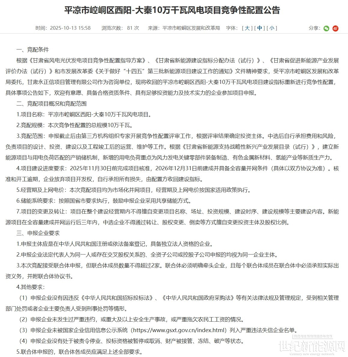 《公告》称,本次竞配项目名称:平凉市崆峒区西阳-大秦10万千瓦风电项目,总规模10万千瓦。