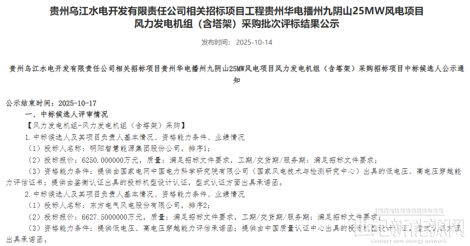 10月14日,华电集团发布《贵州华电播州九阴山25MW风电项目风力发电机组(含塔架)采购批次评标结果公示》。