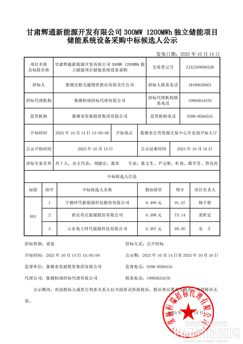 10月14日,甘肃辉通新能源开发有限公司300MW/1200MWh独立储能项目储能系统设备采购中标候选人公示。