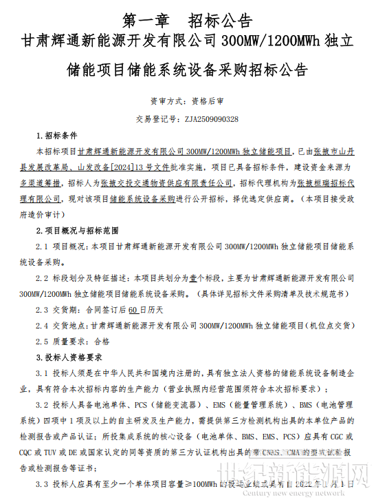 根据招标文件显示,项目共一个标段,主要为甘肃辉通新能源开发有限公司300MW/1200MWh独立储能项目储能系统设备采购。