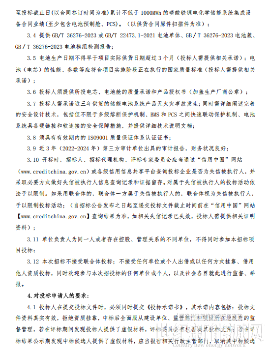 对于投标人业绩要求:投标人应具有至少一个单体项目容量>100MWh的投运业绩或具有自2022年1月1日至投标截止日(以合同签订时间为准)累计不低于1000MWh的磷酸铁锂电化学储能系统集成设备合同业绩(至少包含电池预制舱、PCS)。