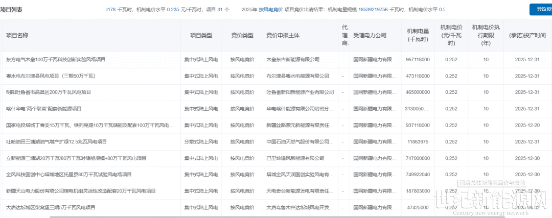 10月15日,国网新疆电力有限公司公示2025年度增量新能源项目机制电价竞价结果。根据公示,风电机制电量规模18,539,219,756千瓦时,机制电价0.252元/千瓦时,项目36个,其中集中式陆风项目34个,分散式陆风项目2个;光伏机制电量规模3,608,399,178千瓦时,机制电价0.235元/千瓦时,项目31个。