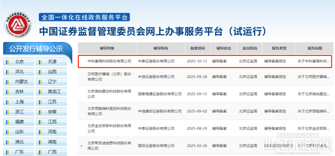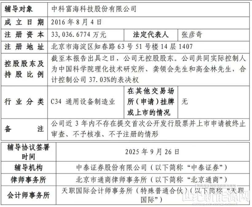 10月13日,证监会IPO辅导公示系统显示,中科富海科技股份有限公司(简称“中科富海”)在北京证监局办理辅导备案登记,拟首次公开发行股票并上市,辅导券商为中泰证券,律所及会计师事务所分别为北京通商、天职国际。