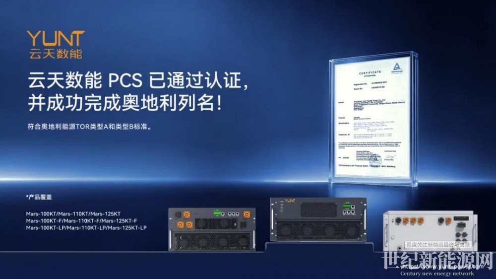 云天数能 Mars 系列工商业储能 PCS 成功通过奥地利 Oesterreichs Energie 认证,近日已完成 125kW 风冷与液冷 PCS 产品列名,标志着品牌正式获得奥地利市场准入资格。