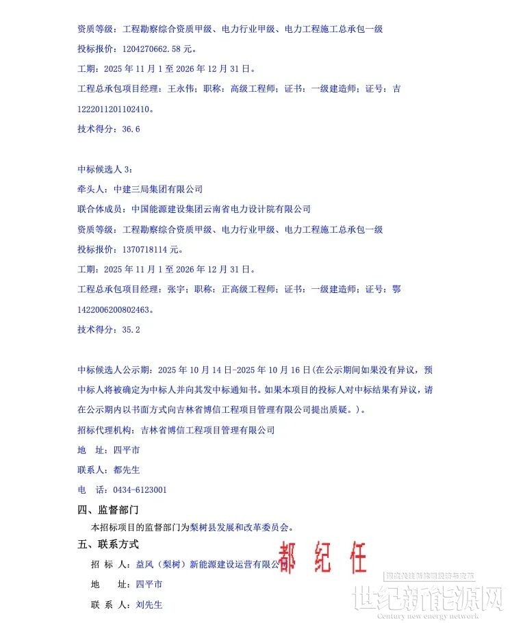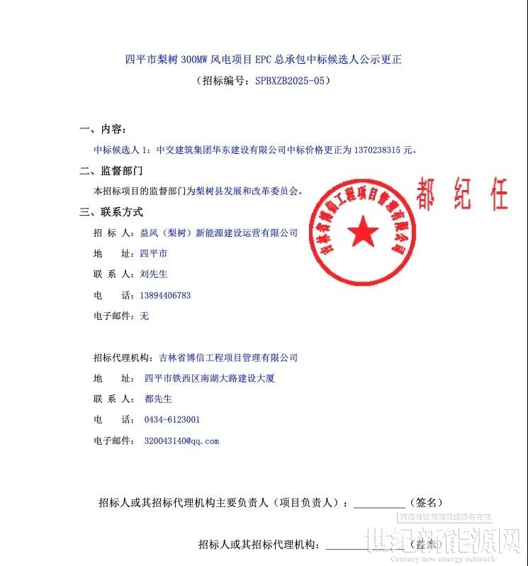 四平市梨树300MW风电项目EPC总承包项目,根据中标候选人公示结果显示: